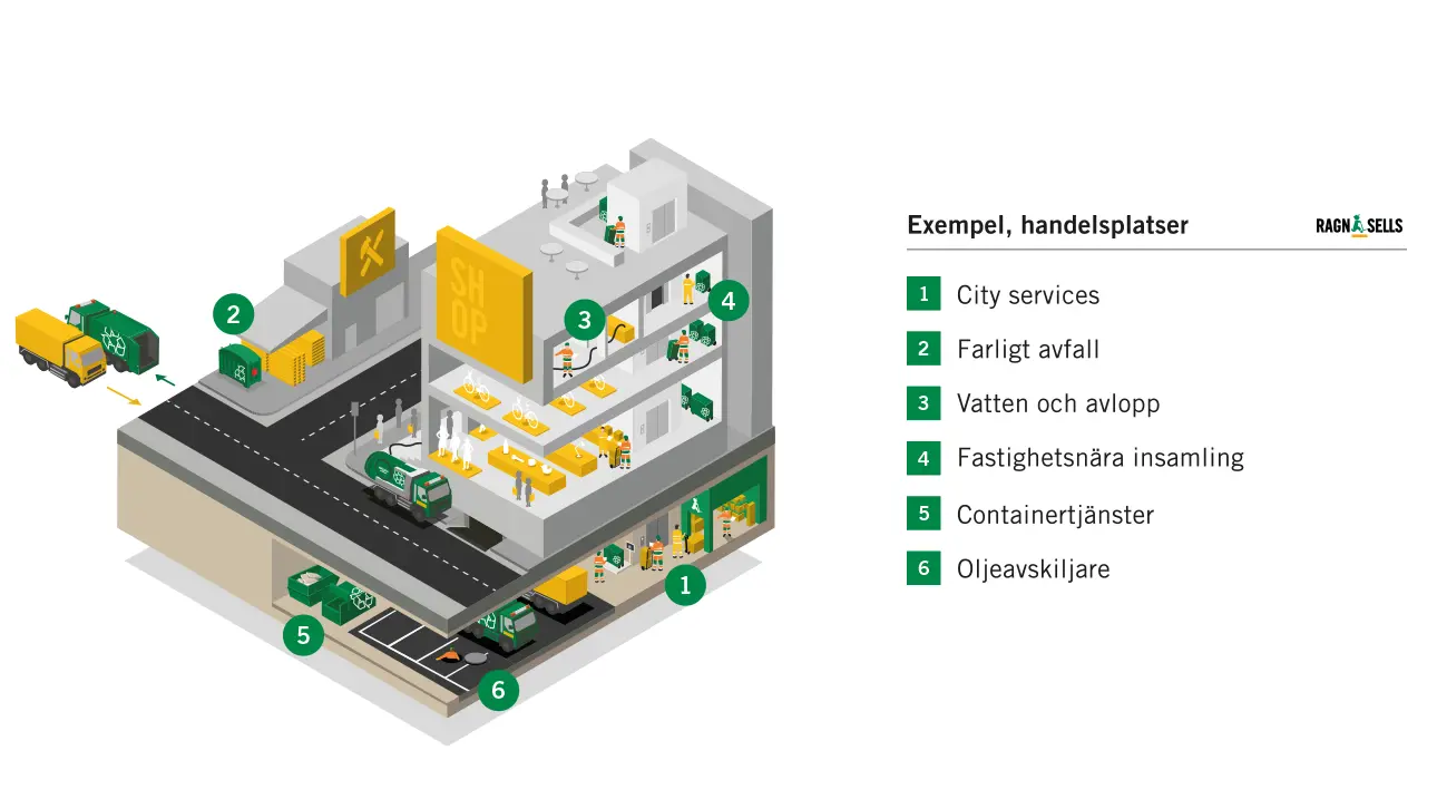 Ragn-Sells erbjuder flexibla logistik och avfallslösningar för större köpcentrum till mindre butiker. Vi återvinner avfallet till nya resurser och kan sköta hela centrumets godsmottagning.