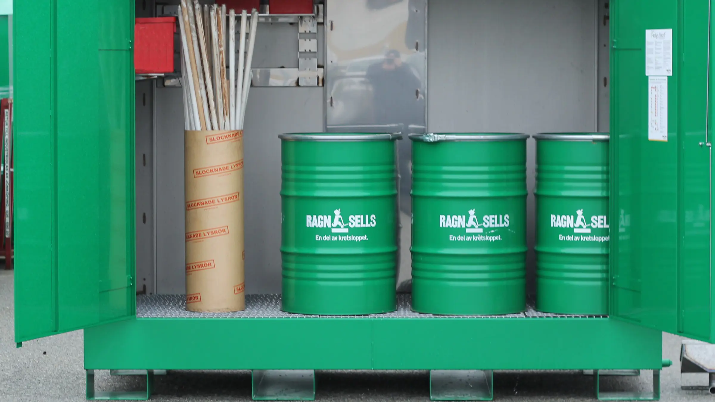 Ditt farliga avfall mellanlagras i rostfria miljöskåp som vi inreder med rätt behållare och levereras kompletta med vår kranbil. Miljöskåpen finns i fem storlekar och är utrustade med lås, uppsamlingsskydd och punktsprinkler.